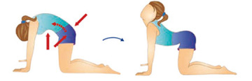 Kleknout na všechny čtyři. Záda vyhrbit do oblouku. Bradu přitáhnout k hrudi. Zatnout břicho a hýždě, svaly konečníku, pochvy a močové trubice. Chvíli vydržet. Prohnout se v zádech, hlavu zaklonit a povolit. Relax.